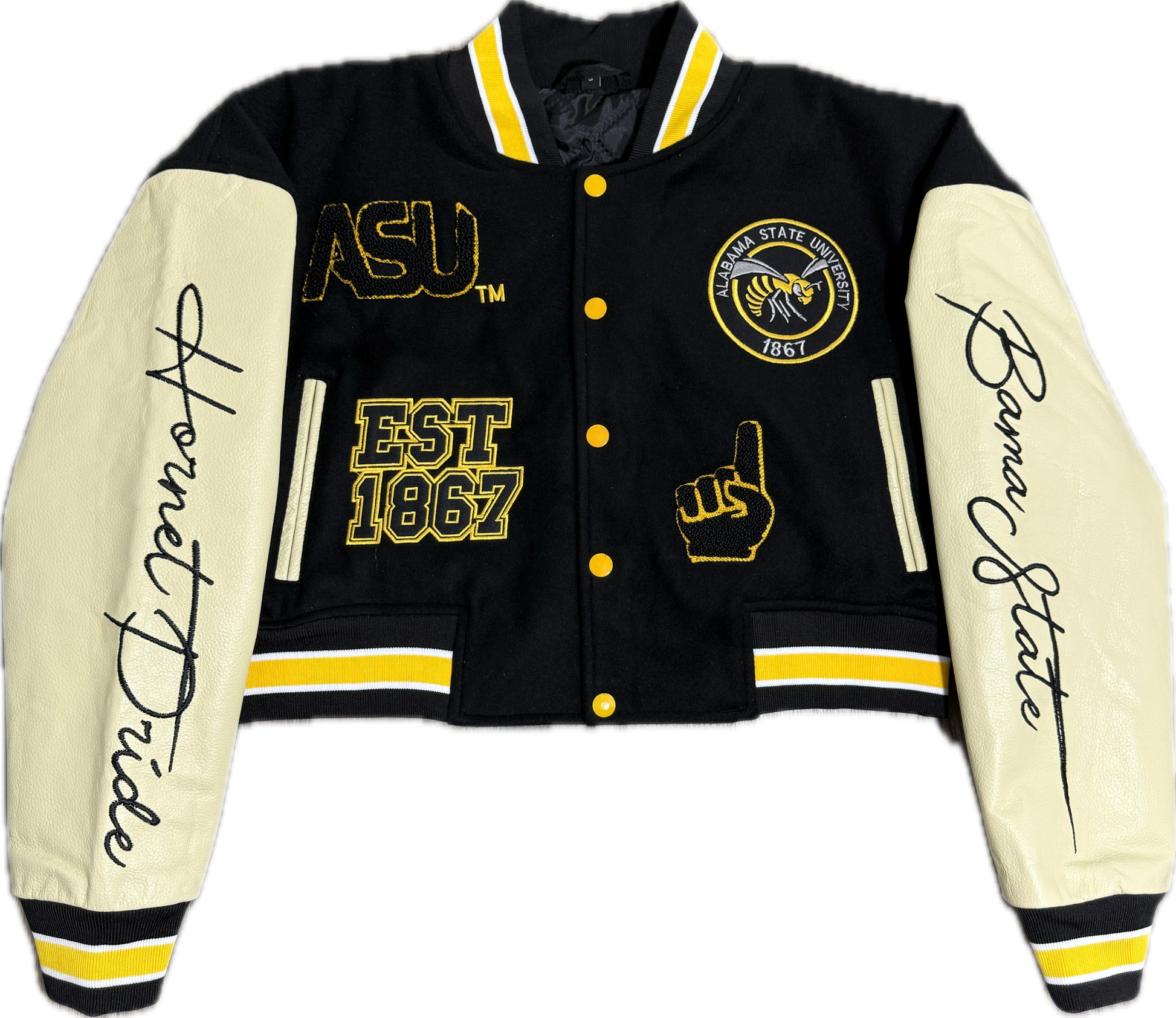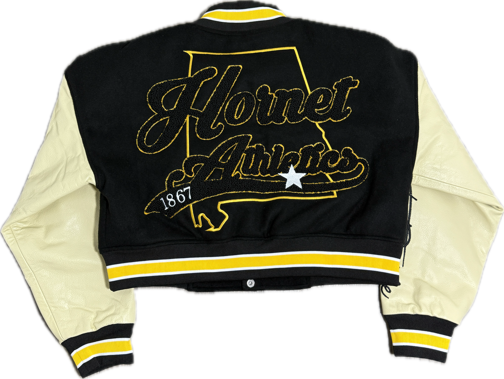 Details: Black/Tan collegiate-style Varsity Letterman jacket