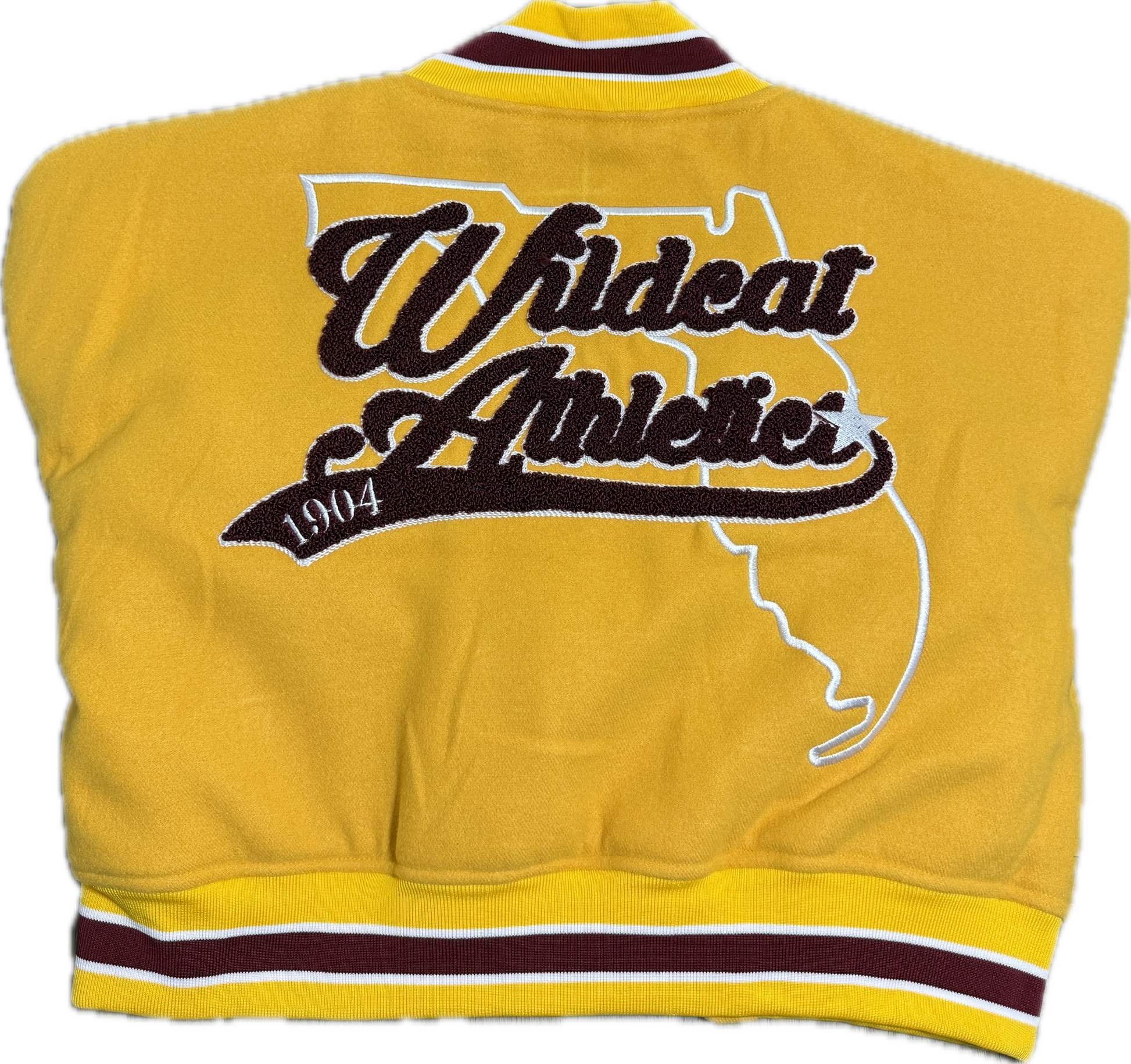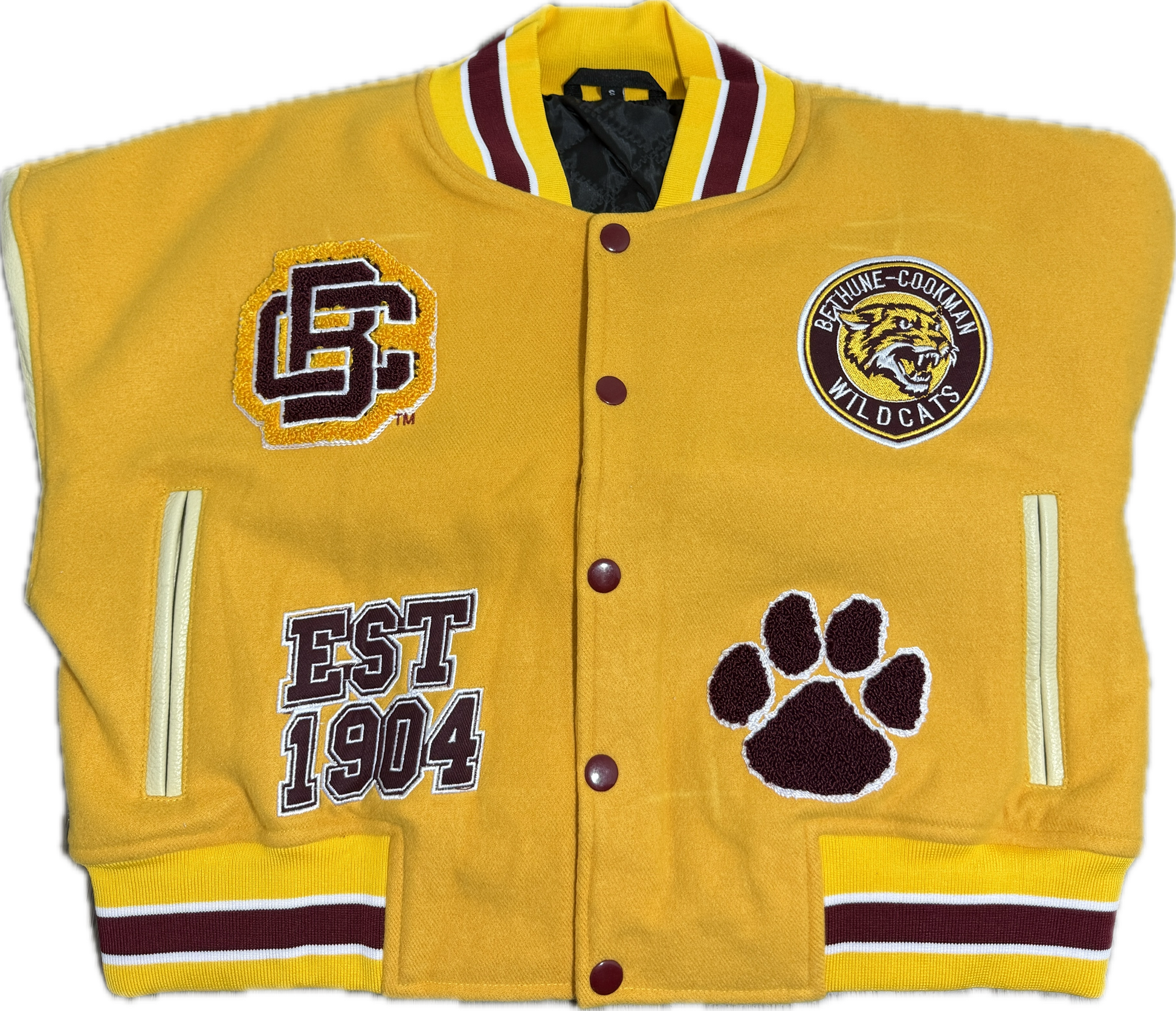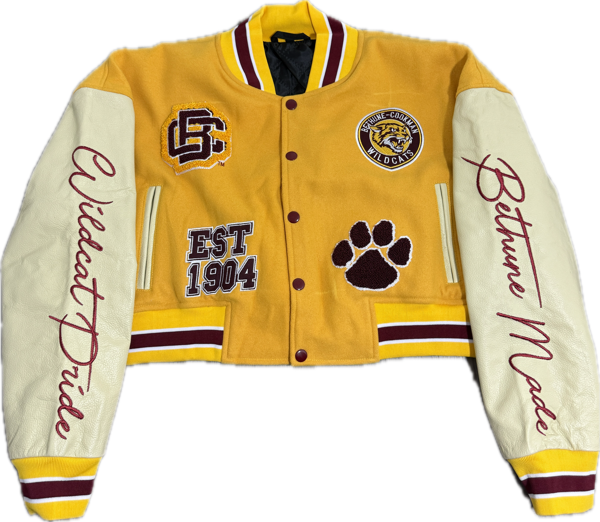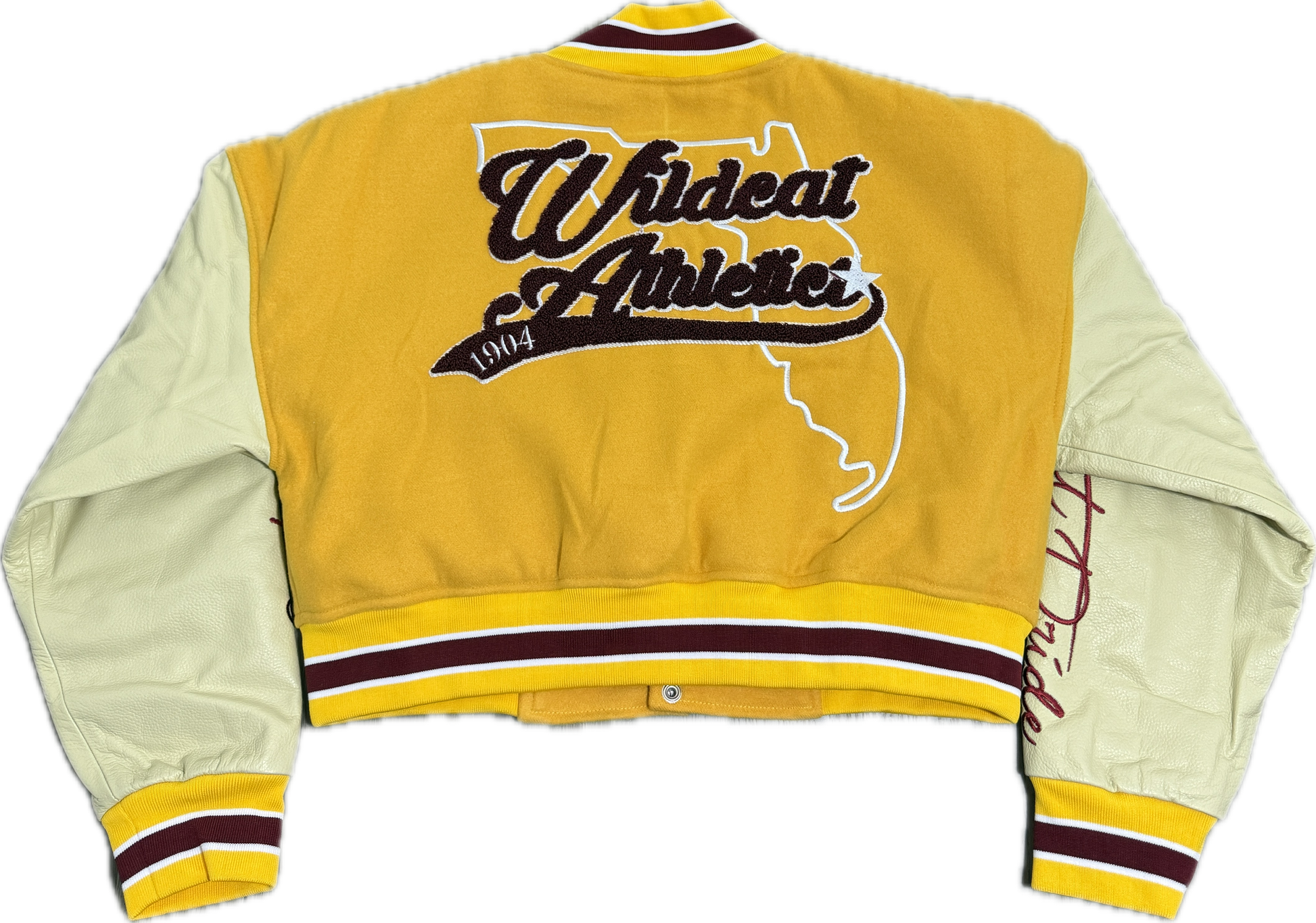 Details: Gold/Tan collegiate-style Varsity Letterman jacket