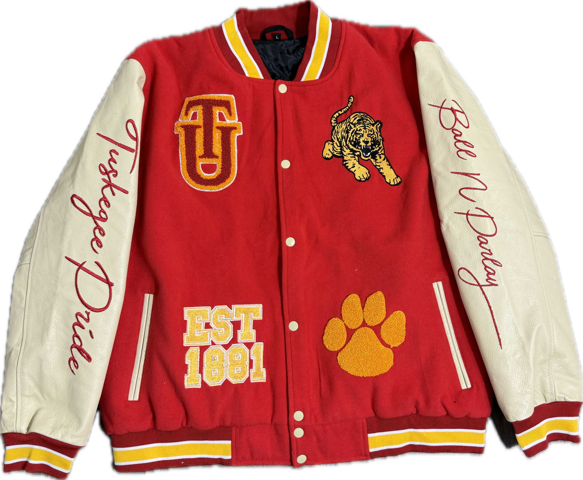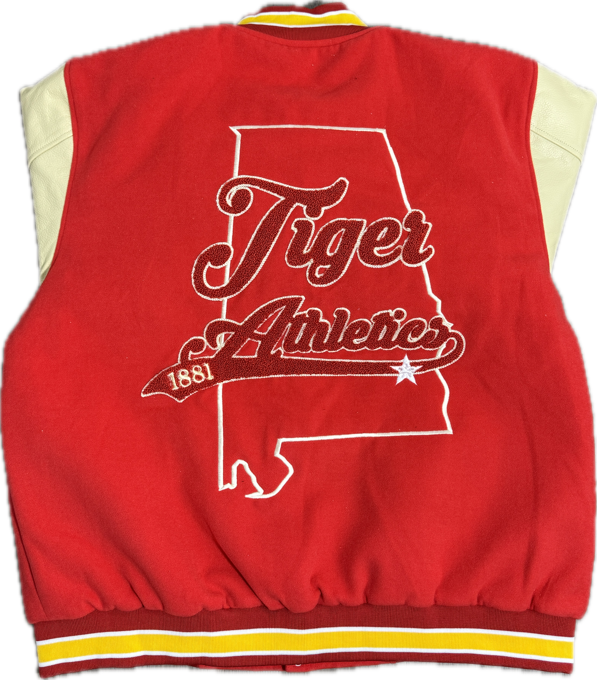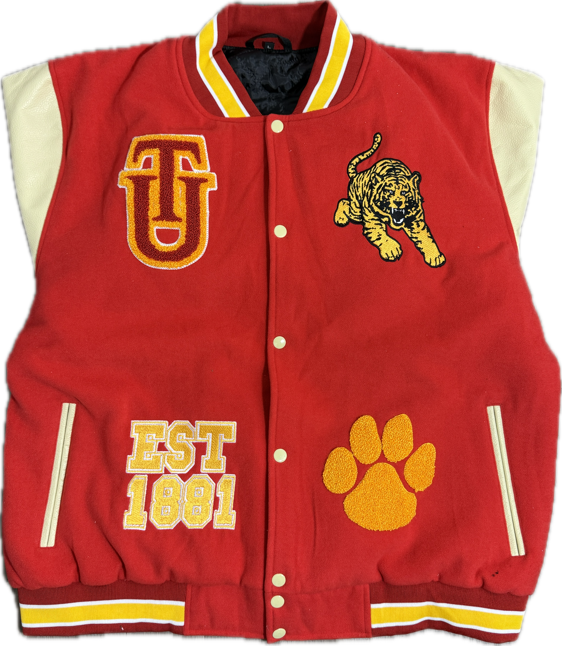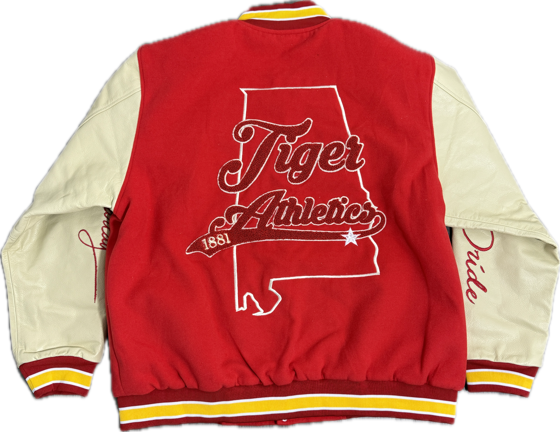 Details: Red/Tan collegiate-style Varsity Letterman jacket